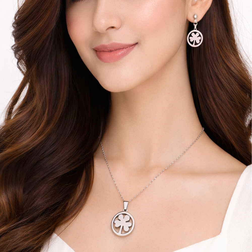 Enhance your everyday style with this Elegant Clover Leaf Silver Pendant Set, a timeless jewelry combination designed to symbolize luck, elegance, and simplicity. This beautifully crafted set includes a round clover leaf pendant necklace paired with matching clover stud earrings, making it a perfect choice for women who love minimal yet meaningful jewelry.