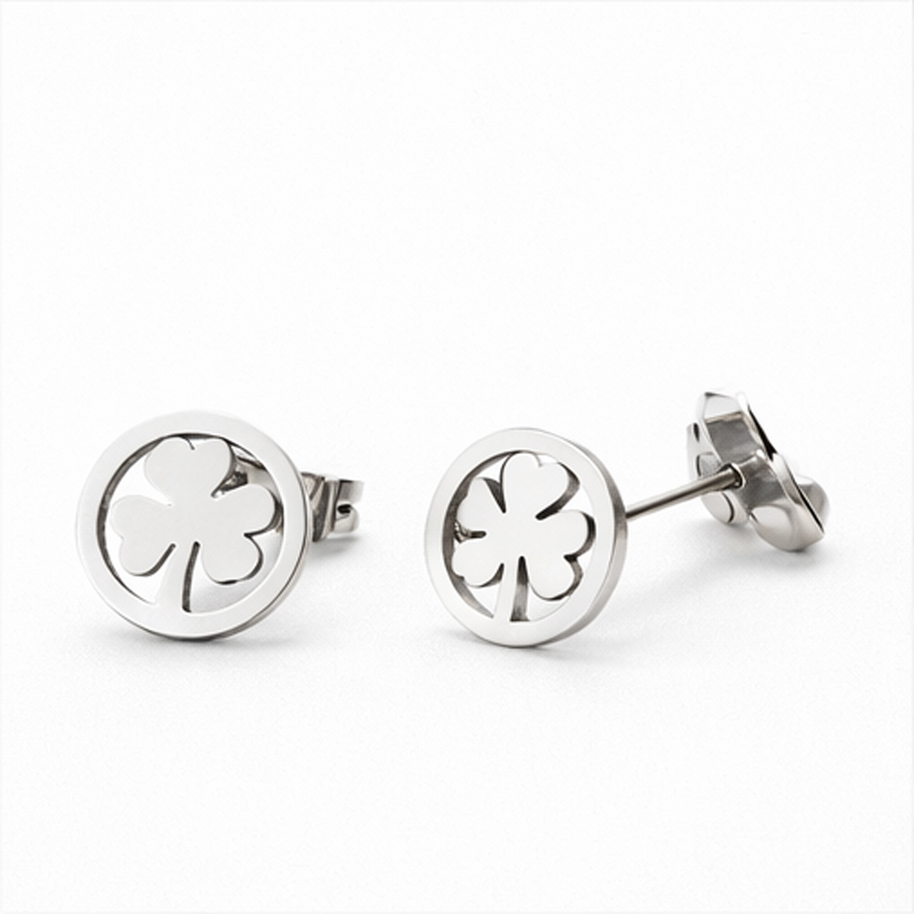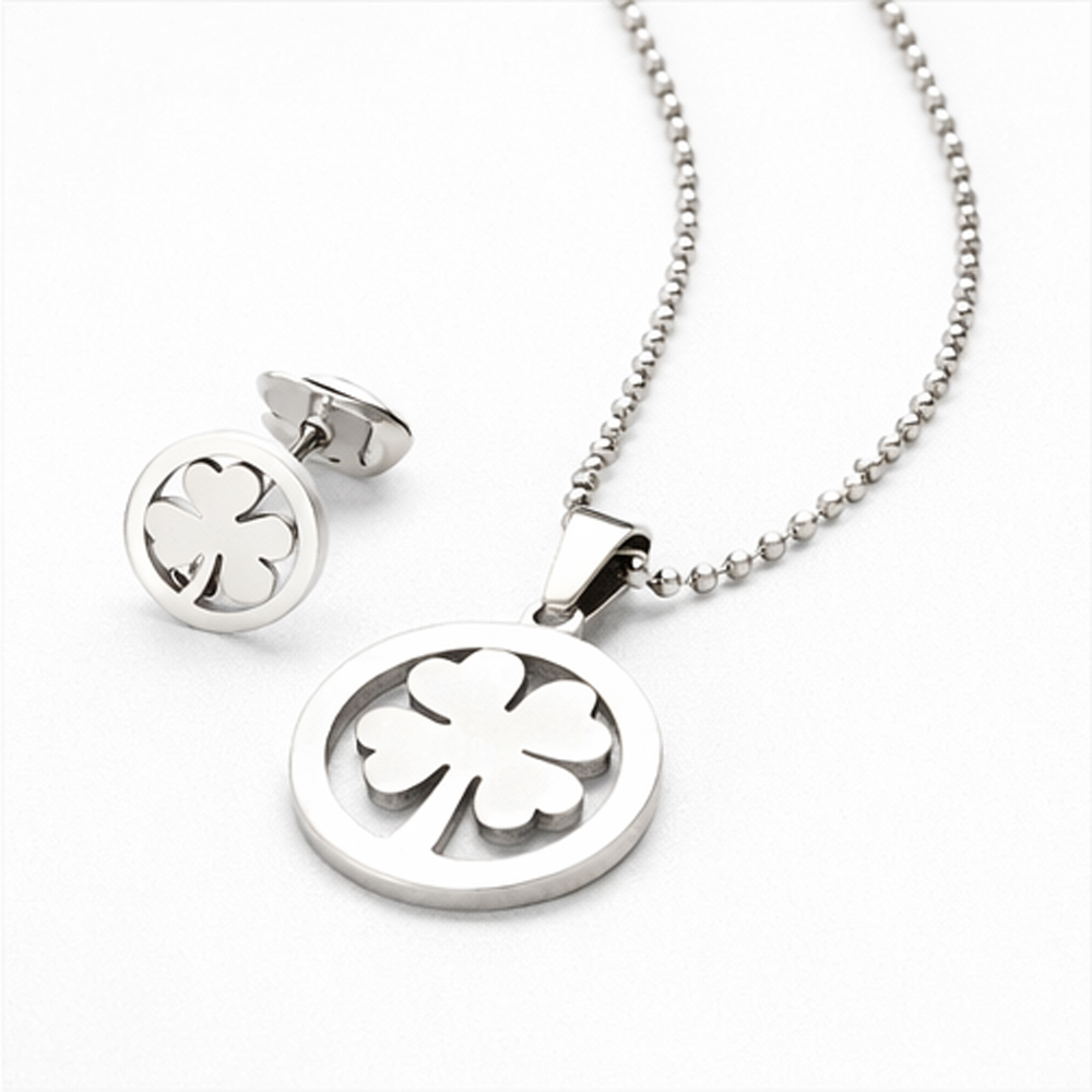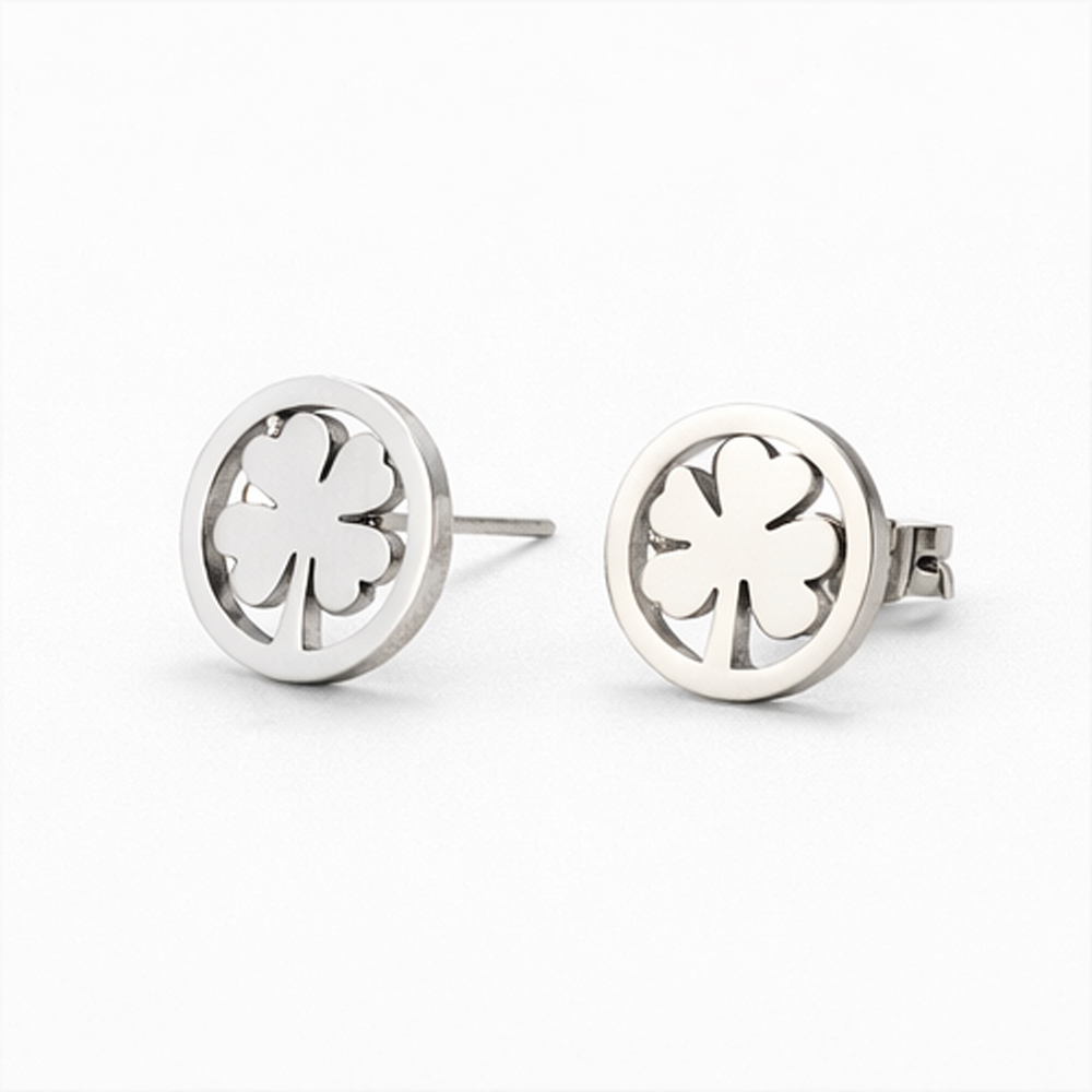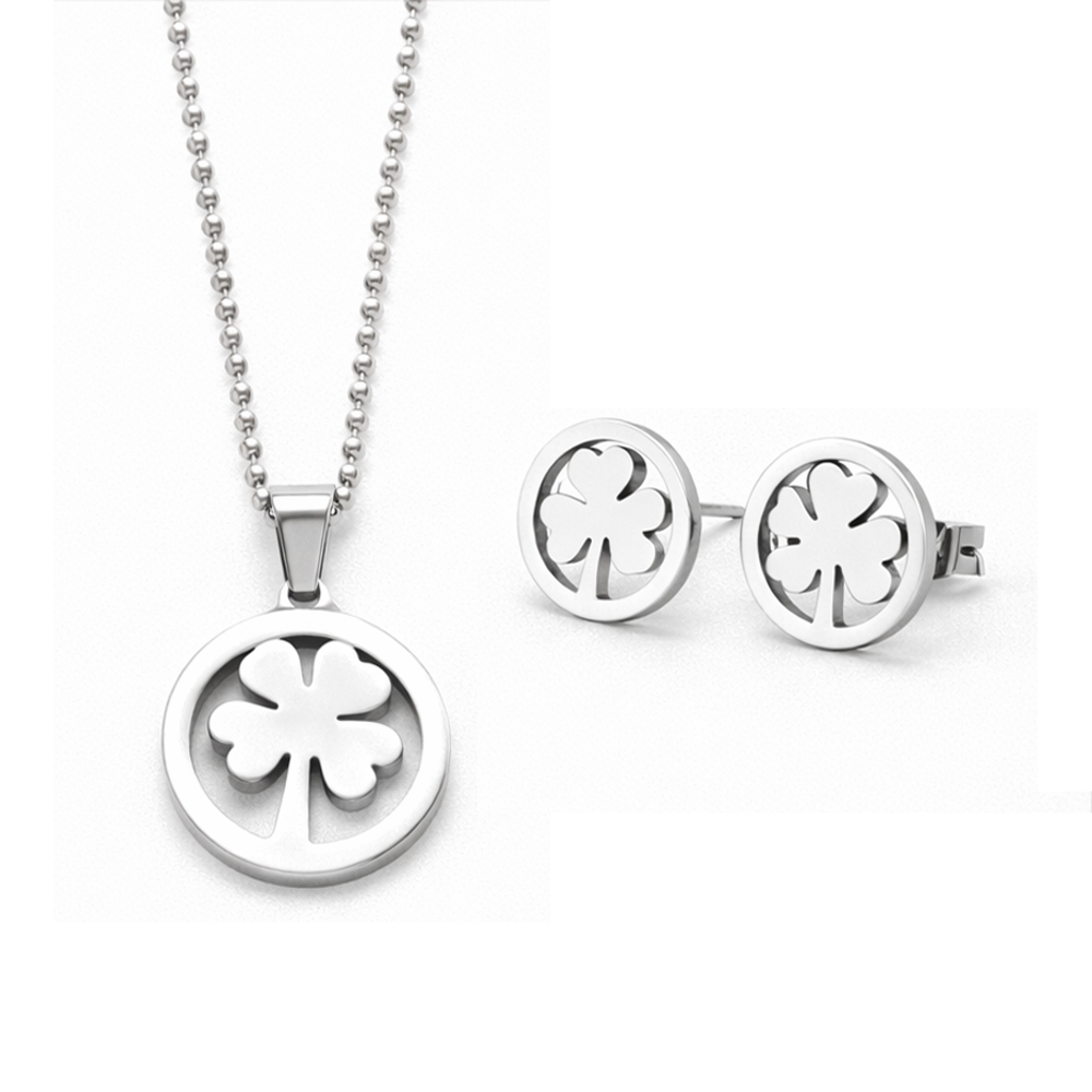 Each piece features a precisely cut four-leaf clover motif enclosed within a smooth circular frame, finished in a polished silver-tone shine. The clean lines and mirror-like surface reflect light gracefully, giving the set a refined and modern appearance. Its minimalist design makes it easy to wear daily while still looking elegant enough for formal occasions.